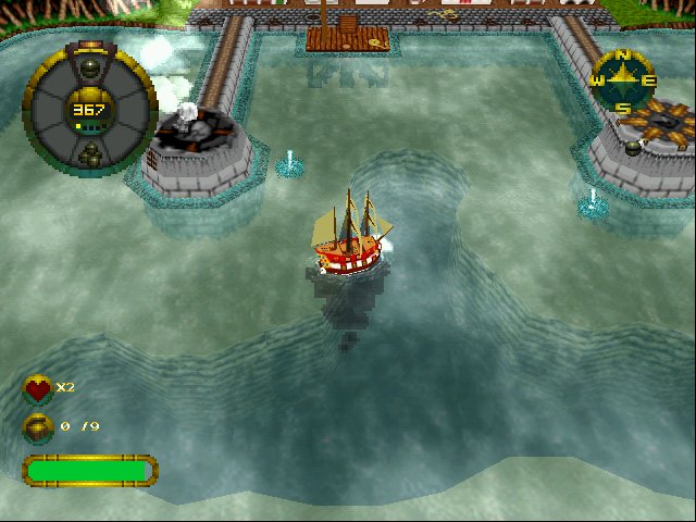 We based the control scheme on the original Playstation console version, with a number of changes to make it more comfortable for play on the 360 controller. You can sail your ship with either the d-pad or the analogue stick. The B button fires the right hand guns and the A button fires the left hand guns. Y button brings up the map and X button triggers a speed boost, when available. The shoulder buttons (mapped to K and L) cycle through the available weaponry. We mapped the page up and page down keys to the analogue triggers and reconfigured the game so that page up was accelerate and page down was brake. Sailing the ship seemed much easier like this. Finally, pressing Start will pause the game and open the in-game menu, as well as skip cutscenes. Pressing Back will take you back up from a menu to the previous menu.