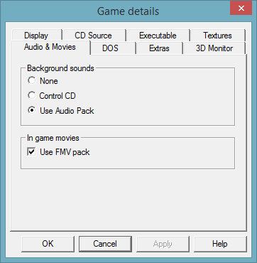 To activate the upgrade packs once installed, start GliDOS and click on “Adjust”. A “Game details” window will then appear. Click on the “Audio & Movies” tab and make sure “Use Audio Pack” and “Use FMV pack” are selected.
