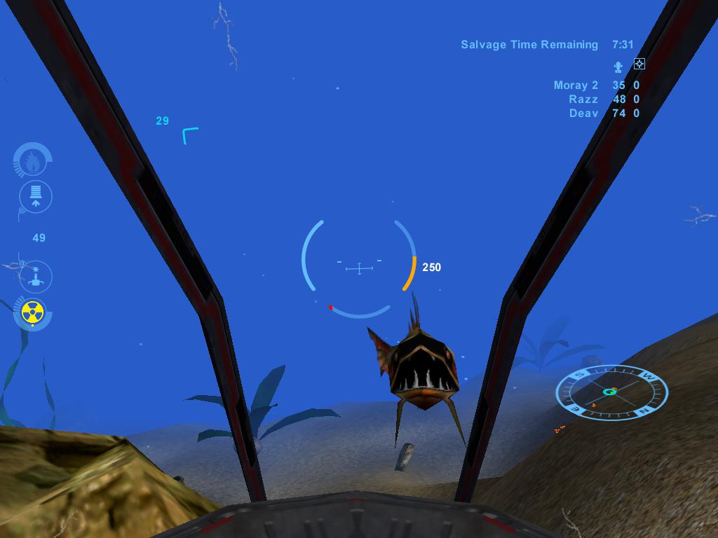 The right analogue stick controls your subs engines (the left stick moves you around, but that’s defined in-game). The right trigger fires your current weapon, while the left trigger activates your subs tools. On the D-pad, you press right to cycle through weapons and left to cycle through tools. Pressing up opens and closes the map while down opens and closes the message log.