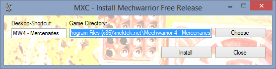 To install Mechwarrior 4: Mercenaries, right click  on the Mechwarrior-XC icon in the notification area and from the menu that appears choose “Install” and then choose “Mechwarrior 4 Mercenaries”. The window shown below should then appear.