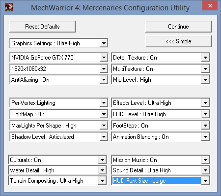 The box second from the top on the left is where you select your graphics hardware. Make sure that your graphics card is selected here and the box is not left blank. Below that, you can select a screen mode. Although Mechwarrior 4 was never designed to run in widescreen, it actually works pretty well at 16:9 or 16:10 resolutions, with just a minor stretch to the HUD graphics, so select your monitors native resolution in this box. The “x32” part on the end of the screen mode is the colour depth, on a modern PC this should always be 32 bit and in most cases the configuration utility will only list 32 bit modes.