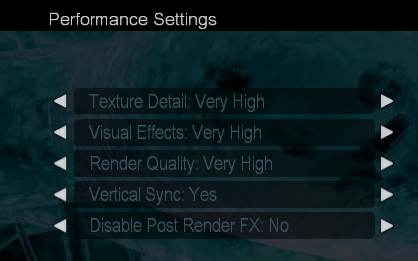 Once you have configured the games screen resolution, click on the “Back” button and then choose “Performance”. The options shown in the picture below will then appear.