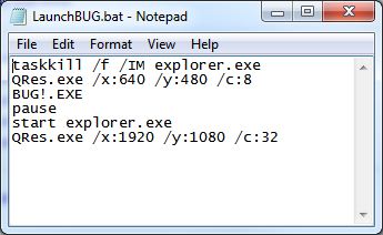 What we need to do next is create a batch file. This file will firstly change the screen resolution to 640×480 with 256 colours. It will then shut down Windows Explorer (to prevent that from interfering with the game), launch Bug! and wait for the game to play. When the game is finished, pressing a key will restore Windows Explorer and your original screen resolution.