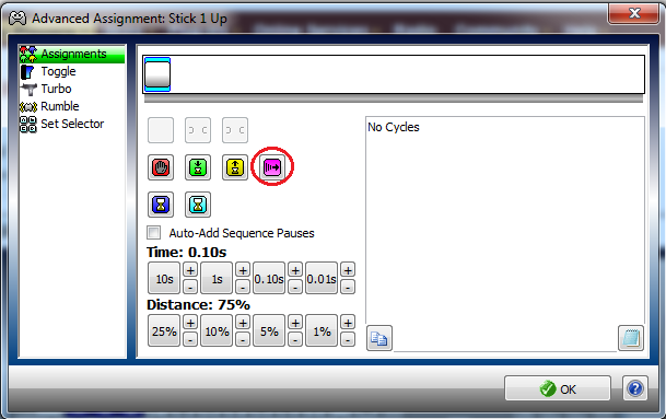 We need to add what Xpadder calls a distance zone. Click on the pink icon circled in red in the picture above. A pink icon with a percentage will then appear near the top of the screen. This icon is now in slot 1. Xpadder will move automatically to slot 2, so press the required key to assign it to this slot, in our case for up that would be ‘W’. Before clicking on “OK”, click back on slot 1. Click on the 25% icon under “Distance:” to assign a distance, then click the plus icon next to it to increase the value until it gets to 75%. The picture below shows the correct configuration:-