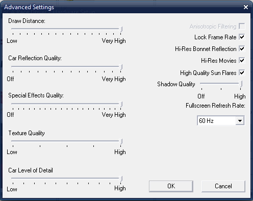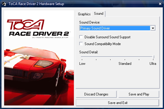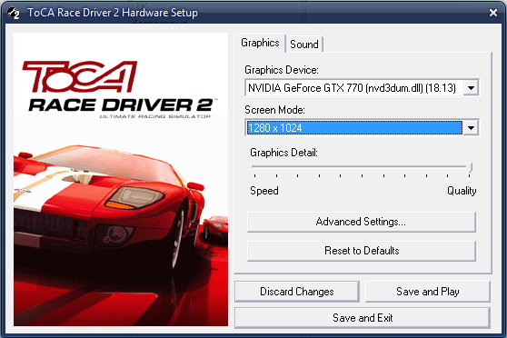 The “Graphics Detail” slider can be bumped all the way to the right on most modern PCs. If you find the game doesn’t run smoothly, come back to the hardware setup again and move this slider down a couple of notches, but as with most old games, ToCA Race Driver 2 will run on most modern PCs at full quality settings without a hitch.