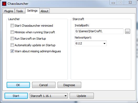 Make sure that “Installpath” points to the directory where you installed Starcraft. If it doesn’t, click on the little “…” button. you will now be able to browse to the directory where you installed the game. Once that is taken care of, click on “Start” to start the game. If you’re not running an administrator account, the launcher may warn you that you don’t have administrative privileges, but this isn’t needed for running the game in window mode. You should now see the game running in a window on your desktop, like this:-