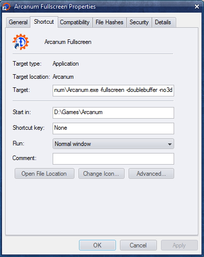 Now, locate the Arcanum Fullscreen shortcut on the Start menu or Start screen. Right click on it and choose “Open File Location”. Now, right click on the icon that appears in the File Explorer window and choose “Properties”. A “Arcanum Fullscreen Properties” window will now appear. Click on the box labelled “Target:” and press the “End” key on your keyboard to move to the end of the line. Now, enter the following:-
