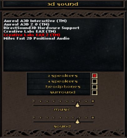 If you don’t have an EAX sound card, you will be limited to the Miles Fast 2D Positional Audio option. The Aureal A3D and DirectSound3D options only work under Windows XP with specific sound cards.