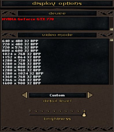 At the top of the window, you can choose which graphics device to use. Usually there is only one choice here. Choose your video mode (or screen resolution) using the list in the middle of the window. You can play the game in any resolution but make sure it is a mode with 32 BPP (bits per pixel). You should note that if you choose a widescreen resolution (such as 1080p, 1920×1080), certain elements (typically the menus and HUD) may appear stretched.
